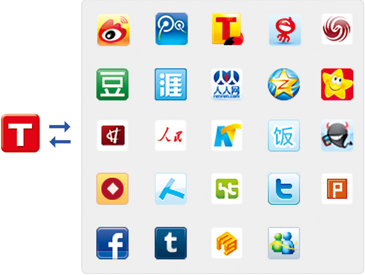 支持:新浪微博、腾讯微博、搜狐微博、网易微博、饭否、天涯微博、人民微博、新华微博、豆瓣、凤凰微博、QQ空间、开心网人人网、和讯微博、移动微博、嘀咕社区、 中金微博等20多家微博及SNS网站;(如有变动,请按系统可绑定的平台为准)